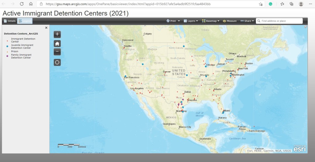 Explore more with this link to an interactive ArcGIS Online WebApp map about the detention centers that are still in use as of April 2021: Active Immigrant Detention Centers (2021) (arcgis.com) The image above is what the map should look like. With this map you can zoom in and out as well as move around. This ArcGIS WebApp will only work on laptops and desktops. It does not seem to work on smart phones.