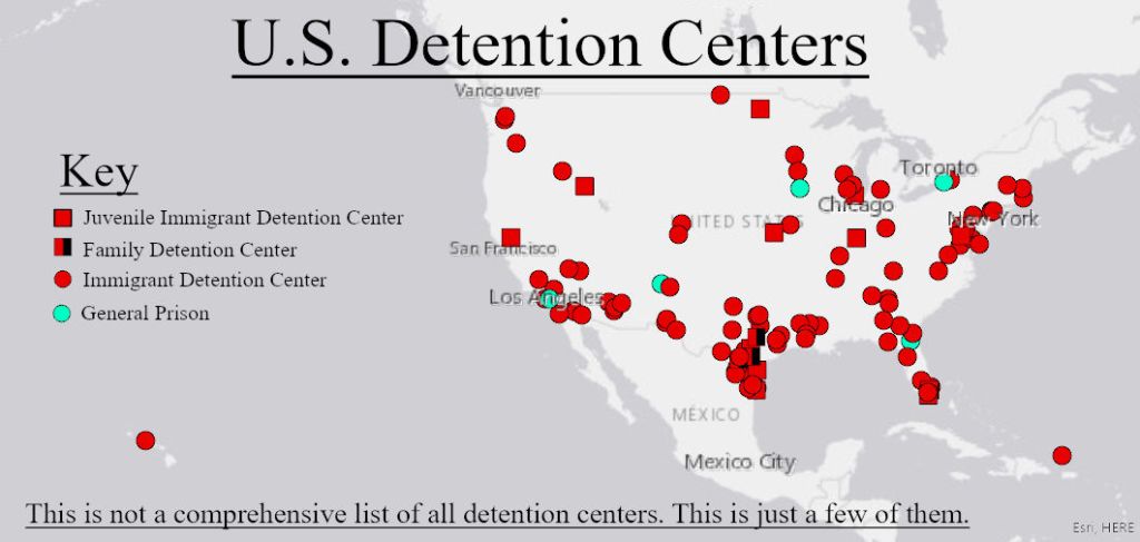The image above is a map of 118 facilities that are dedicated detention centers or are a location that holds immigrants. The map is not a comprehensive map as there are many more detention centers in the United States that are still running. Below is the “U.S. Detention Center” map I just mentioned.